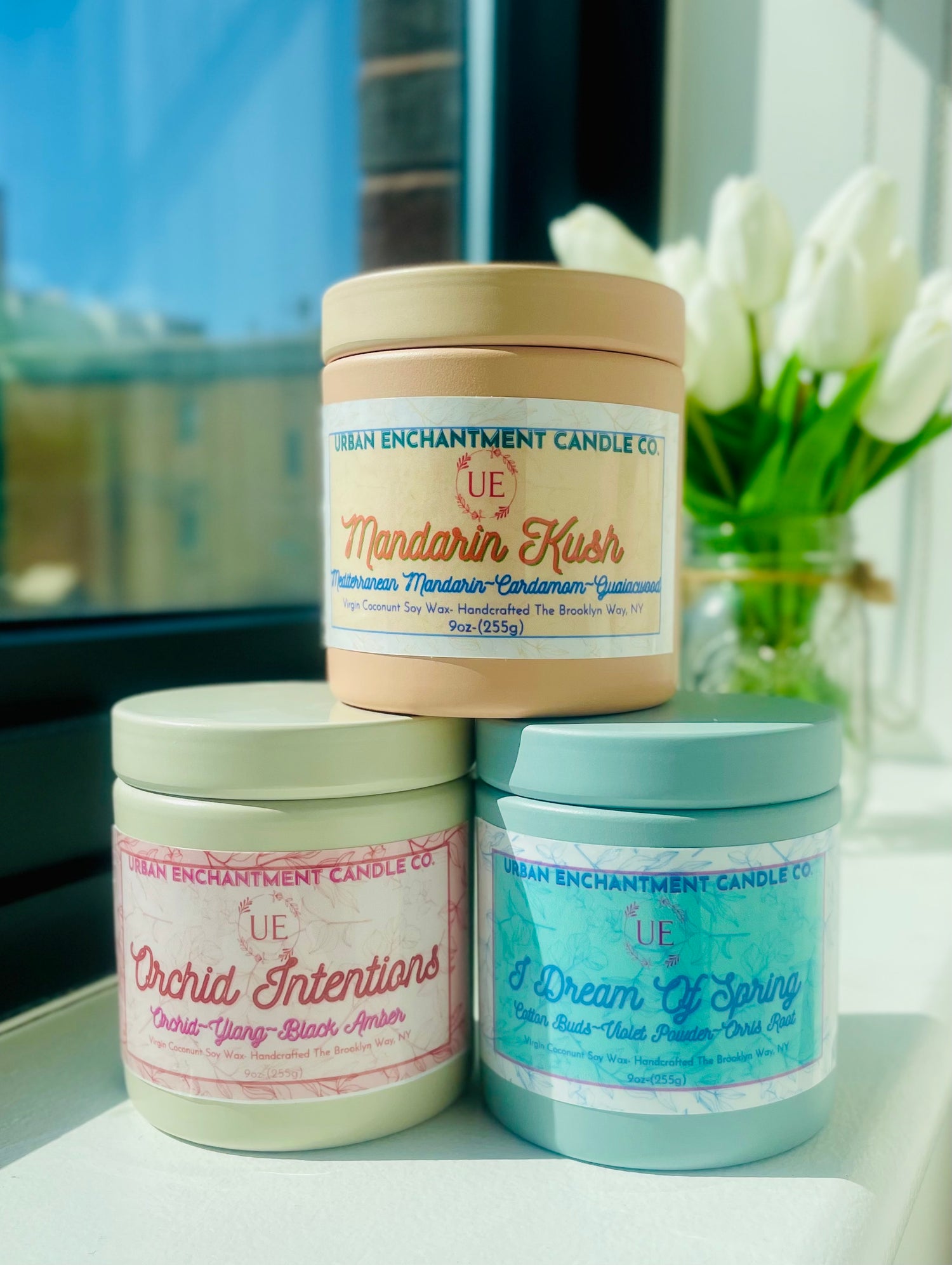 All Urban Enchantment Candle Co. candles are vegan(free of animal based ingredients like stearic acid and beeswax). We here at Urban Enchantment Candle Co. do our absolute best to reduce our carbon footprint so we can co-exist in perfect harmony with our beautiful planet!